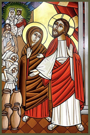 Expecting her Son to perform that first miracle that will inaugurate his public ministry on earth in the shadow of the Cross, Mary faithfully approaches him with her tacit request. Here, we must note the rich symbolism in this circumstance, where the lack of wine renders the wedding feast a disaster in ancient Jewish culture. The wine is evocative of the blood of the new and everlasting Covenant (Mt.26:27-28). The elements of wine and blood are identified at our Lord’s paschal supper with his apostles on the eve of his passion and death at the Jewish Passover.